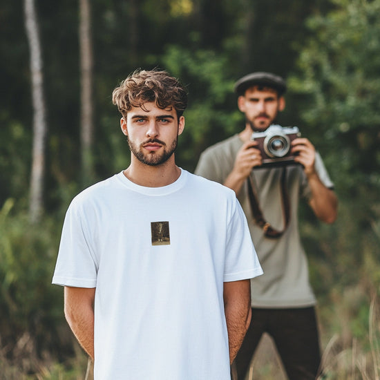 This photo likely dates from 1920–1935, showing a young man posing proudly with a camera, possibly during a leisure trip or outing in the countryside. He is standing outdoors, leaning slightly against a birch tree. He’s dressed in an old-fashioned outfit: a suit jacket, tie, short trousers (knee-length), high socks, and formal shoes. This style was common in the early 20th century, especially around the 1910s to 1930s. He’s holding an old box camera, smiling warmly — he might be a hobby photographer or just excited to have his picture taken. The background shows a lush forest or park, mostly birch trees and a little winding path. The photo has a slightly sepia tone, giving it that classic early 1900s feel. It's a little worn at the edges but still beautifully preserved.